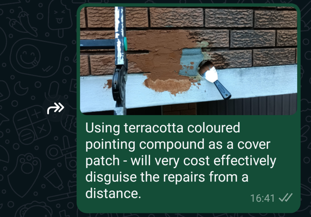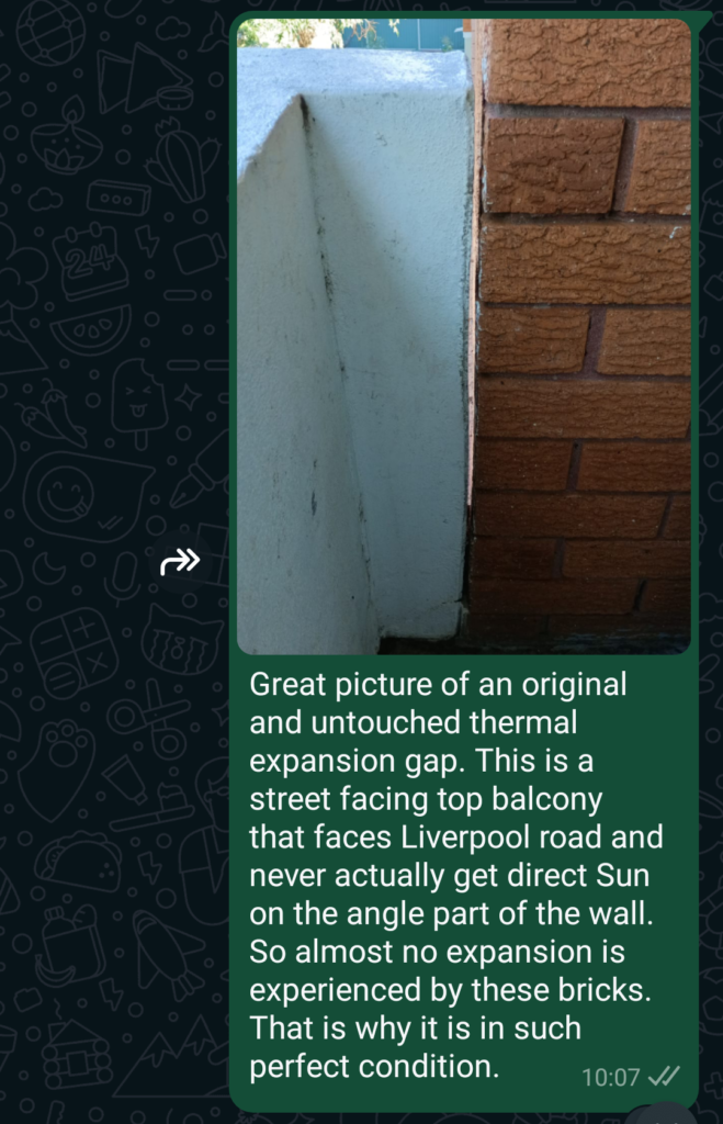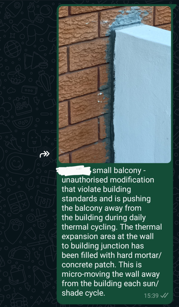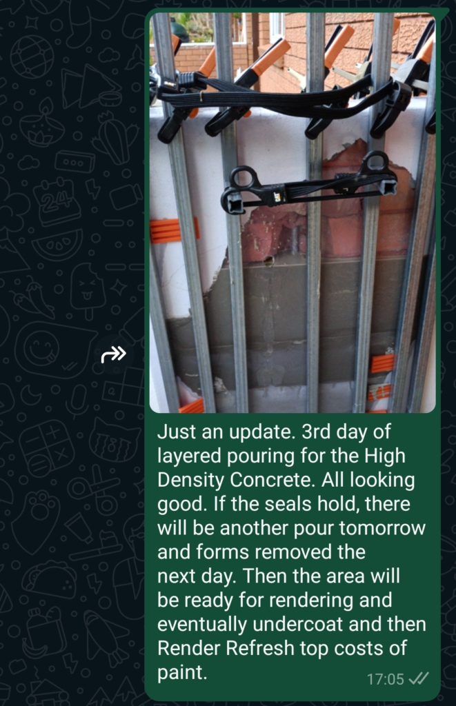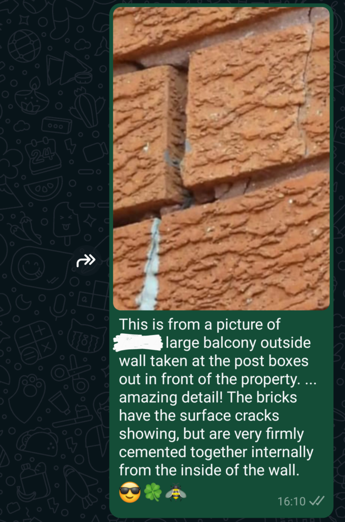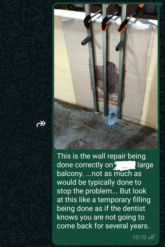 Much of the maintenance work done on the 72 balconies on this property cannot be seen from the outside of a balcony. Most repairs are done from the inside to minimise damage to the outer brickwork.